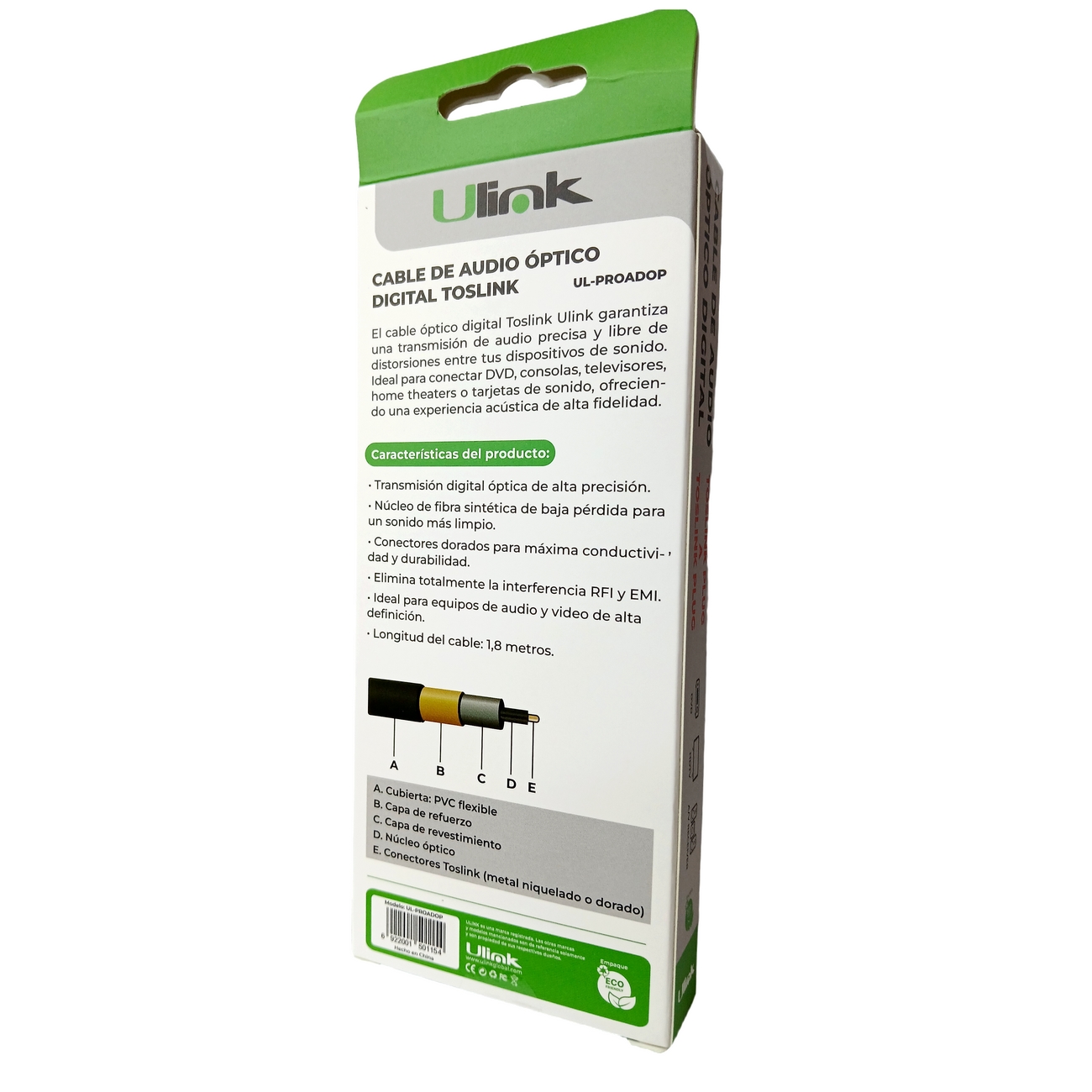 El cable de audio óptico digital Toslink UL-PROADOP está diseñado para entregar una transmisión de sonido pura, estable y libre de interferencias, ideal para sistemas de audio digital de alta fidelidad. Gracias a su tecnología de transmisión por luz, elimina completamente ruidos eléctricos, garantizando una experiencia sonora limpia incluso a volúmenes elevados.